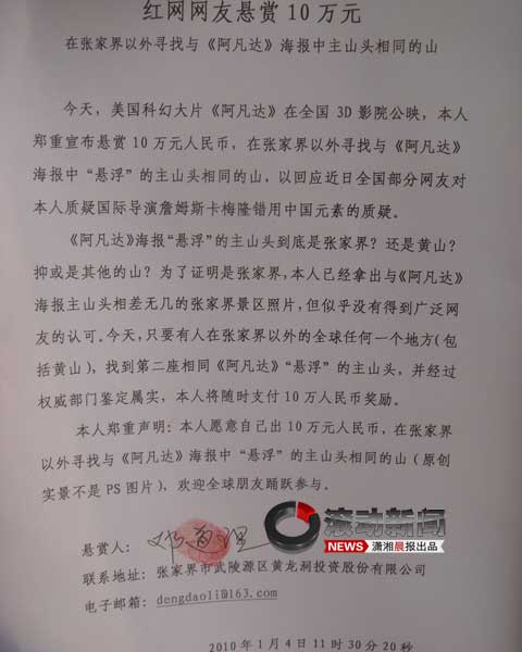 1月4日,美國(guó)科幻大片《阿凡達(dá)》在中國(guó)內(nèi)地3D影院正式公映,曾經(jīng)炮轟該片導(dǎo)演詹姆斯卡梅隆“張冠黃帶”誤將黃山說(shuō)成張家界的網(wǎng)友“hldddl”同日宣布:由他本人懸賞10萬(wàn)元,面向全球?qū)ふ业诙嗤栋⒎策_(dá)》海報(bào)中“懸浮”的主山頭,以回應(yīng)近日全國(guó)部分網(wǎng)友對(duì)他質(zhì)疑國(guó)際導(dǎo)演詹姆斯卡梅隆錯(cuò)用中國(guó)元素的質(zhì)疑。 原起:《阿凡達(dá)》未映先熱 一部還沒(méi)上映的《阿凡達(dá)》,已吊足了觀眾的胃口。2009年12月23日,《阿凡達(dá)》導(dǎo)演卡梅隆曾透露:片中“哈利路亞山”的原型,來(lái)自中國(guó)黃山。12月29日,湖南張家界網(wǎng)友“hldddl”發(fā)帖《明明是張家界,《阿凡達(dá)》導(dǎo)演偏說(shuō)是黃山》,對(duì)卡梅隆的說(shuō)法提出質(zhì)疑,說(shuō)原型其實(shí)是在張家界而不是在黃山。不少湖南網(wǎng)友紛紛跟帖,力挺“哈利路亞山”原型是張家界的說(shuō)法,甚至有網(wǎng)民要求:“讓卡梅隆道歉,以正視聽(tīng)。 當(dāng)事人:懸賞10萬(wàn)元全球征集《阿凡達(dá)》懸浮山 據(jù)了解,這位名叫“hldddl”的網(wǎng)友真名叫鄧道理,供職于張家界黃龍洞投資股份有限公司,從事旅游宣傳工作多年。2009年12月29日,鄧道理在紅網(wǎng)論壇發(fā)表圖文帖《明明是張家界,<阿凡達(dá)>導(dǎo)演偏說(shuō)是黃山》,帖中曝料導(dǎo)演詹姆斯•卡梅隆信口雌黃,稱海報(bào)中“哈里路亞山”的原型來(lái)自中國(guó)的黃山。他用自己拍攝的與海報(bào)主山頭相同的張家界景區(qū)照片提出質(zhì)疑,稱“哈里路亞山”的原型不是來(lái)自安徽黃山,而應(yīng)是湖南張家界,并戲稱是張冠黃戴。 媒體:海內(nèi)外媒體對(duì)此廣泛關(guān)注 一石激起千層浪。張家界網(wǎng)友炮轟《阿凡達(dá)》導(dǎo)演卡梅隆后,受到海內(nèi)外媒體的廣泛關(guān)注,也引起了海內(nèi)外近億萬(wàn)網(wǎng)友的強(qiáng)烈反響。有的支持不迷信權(quán)威的行為,有的認(rèn)為是在炒作,也有人認(rèn)為發(fā)帖人很無(wú)聊。