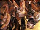 (注:張家界市場(chǎng)上出售的臘肉一般有兩種:一種為專(zhuān)門(mén)的熏烤店熏制的臘肉,另一種為農(nóng)家自制的臘肉。以上兩種臘肉,前種包裝精美,后種無(wú)包裝,但味道特別香淳。)