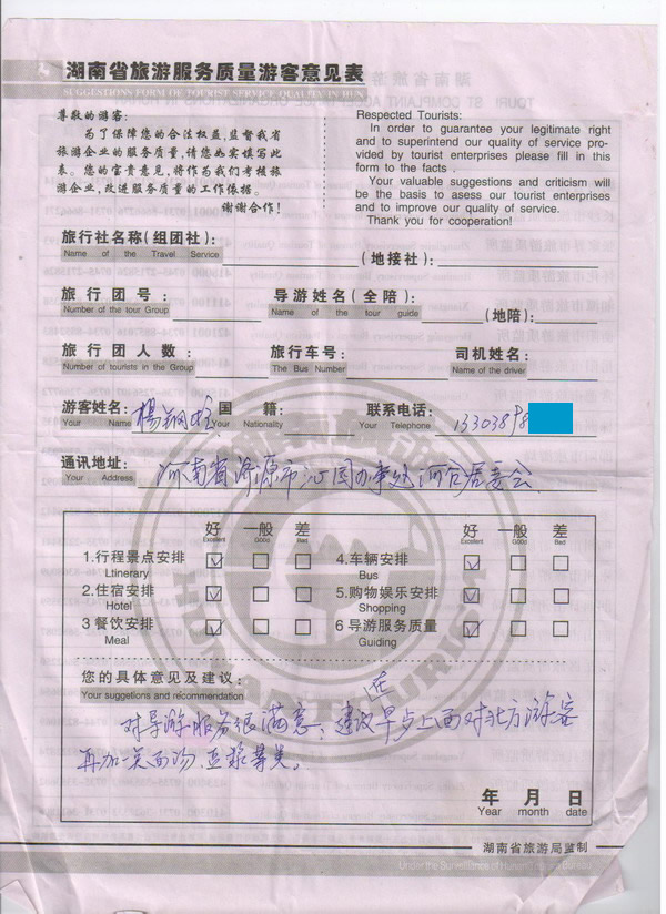 河南楊先生一行38人旅游質(zhì)量回饋