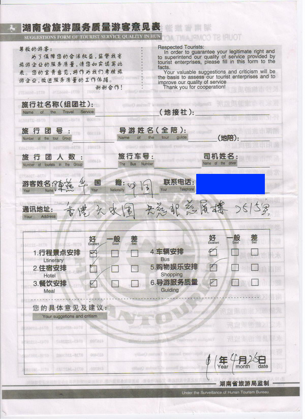 香港陳先生一行6人旅游質(zhì)量回饋: