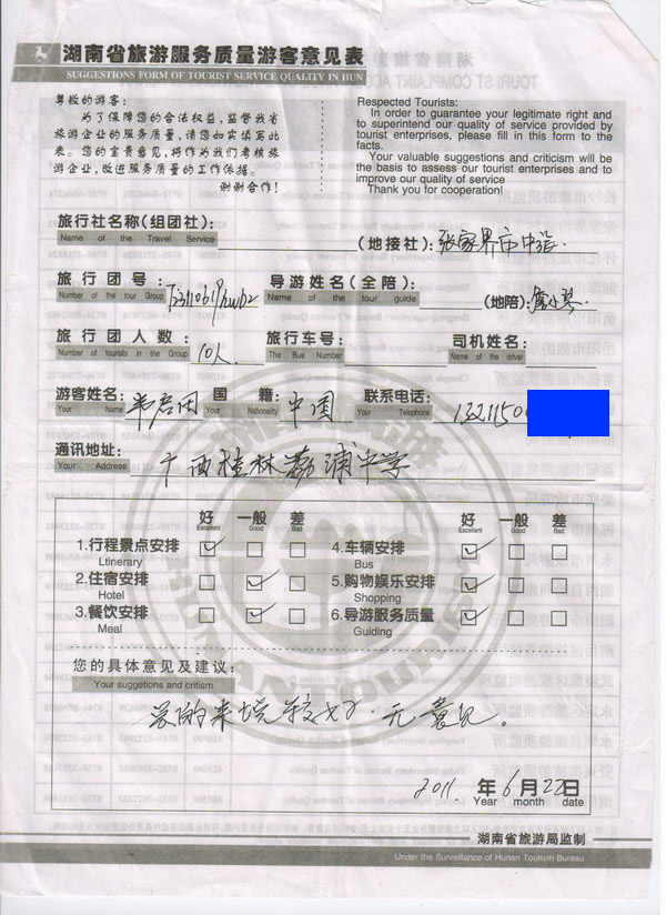 廣西韋先生一行10人旅游質(zhì)量回饋