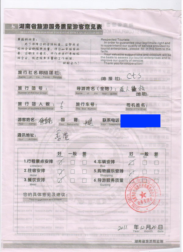 香港陳先生一行6人旅游質量回饋