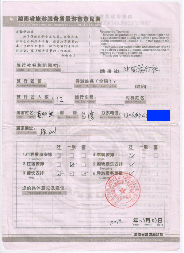 臺(tái)灣蔡先生一行12人旅游質(zhì)量回饋