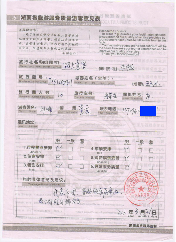 重慶劉先生一行18人旅游質(zhì)量回饋
