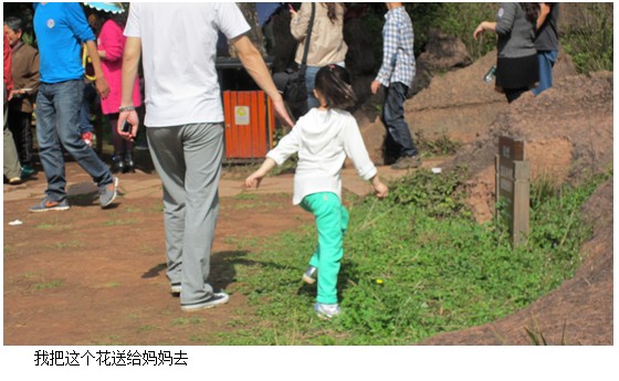 當(dāng)看到路旁的各種野花時(shí),這位小女孩又突發(fā)奇想:“爸爸,等等我,我給媽媽送朵花!薄安灰S便摘花哦!痹捯粑绰,女兒卻早已將野花摘在手上。等趕到媽媽將花送給媽媽時(shí),媽媽的臉上洋溢著的是滿滿的欣慰與幸福,“來我給你插上!眿寢寣⑿∫盎ú逶诹诵∨⒌念^上。