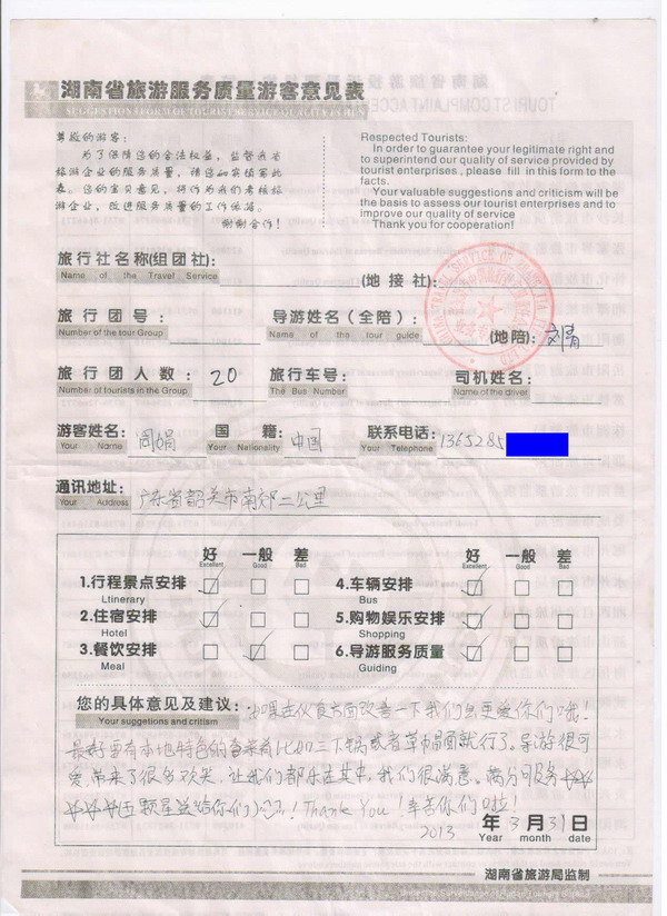 廣東周小姐一行20人旅游質(zhì)量回饋單