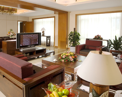 CEO套房,面積110平米,由兩個(gè)寬敞的客房和一個(gè)大廳組成,不論是從客廳還是從臥室都可看到美麗的園林景觀和室外游泳池。