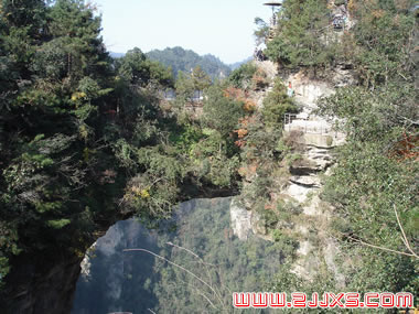 “后花園”至天下第一橋,有一條全長2000多米的游道,路面多為白色的條石鋪成,站在遠(yuǎn)處觀望,很像一條白色的綢帶打了兩個結(jié),一頭系在“迷魂臺”,一頭第在“天下第一橋”。信步漫游,沿途可欣賞到“拜仙臺”、“百丈絕壁”、“小洞天”、“情人谷”等別有情趣的景點(diǎn),這里海拔不高,一般不受氣候影響,慢慢品味,定會使您賞心悅目。