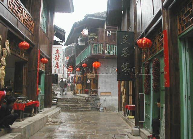 溪洲銅柱現(xiàn)存于芙蓉鎮(zhèn)民俗風(fēng)光館內(nèi)。公元940年,楚王馬希范與溪州刺使彭士愁多年交戰(zhàn)媾和,締結(jié)盟約,劃疆而冶,鑄5000斤銅柱為證。據(jù)史截:“后晉天福四年(公元939),溪州刺史彭士愁與當(dāng)時(shí)占據(jù)湖南的楚王馬希范發(fā)生溪州之戰(zhàn)。彭士愁戰(zhàn)敗后于后晉天福五年(公元940年)與馬希范議和,把戰(zhàn)爭(zhēng)的經(jīng)過和議和的條款,鐫刻于銅柱之上。銅柱重五千斤,高丈二尺,入土六心,形為八面,中空,內(nèi)實(shí)鉅錢,柱端覆蓋銅頂,銘誓狀于銅柱之上,立于會(huì)溪,宋天禧二年(公元1018年)重立時(shí),又羼刻了一些土官銜名。清中葉,柱上銅頂被盜,沉于江心,柱內(nèi)銅錢亦被人以飴粘錢殆盡。清光緒十一年(公元1885年),永順府知府張?jiān)鴵P(yáng)建亭保護(hù)。民國年間亭被毀!便~柱的銅質(zhì),精純光潤;八面所鐫顏、柳體陰文,雖經(jīng)千載風(fēng)雨洗刷,霜雪蝕磨,仍清晰如初。溪州銅柱是研究土家族古代歷史的重要文獻(xiàn)。土家族視銅柱為神物。 古鎮(zhèn)石板街遠(yuǎn)遠(yuǎn)望去,總感覺芙蓉鎮(zhèn)五里青石板街就像一本線裝古籍的書脊,書頁被上蒼之手打開,靜謐而又穩(wěn)重地?cái)傇谟纤舆,那書頁上凌空的吊腳樓和發(fā)生在樓里樓外的悲歡離合便隨歲月而動(dòng),演繹出許多鏗鏘溫馨、跌宕起伏的故事來…… 湘西芙蓉鎮(zhèn)這個(gè)看上去普普通通的村落,原來是秦漢時(shí)土王的王都,古稱酉陽,五代十國時(shí)稱溪州。后因電影《芙蓉鎮(zhèn)》在此拍攝,于是人們便把此地叫做芙蓉鎮(zhèn)。 史書記載“位酉水北面,是酉水的重要碼頭,通川黔、達(dá)鄂瀘,舟楫之便,得天獨(dú)厚”。 從碼頭開始綿亙而上的石階,那是一條長達(dá)五里貫穿古鎮(zhèn)的青石板路,它沒有名字,于是人們就直接管它叫五里長街。踏上古街,似乎踩在被悠長歲月遺落的碎片上面。不知不覺走到掛有“土家觀瀑吊腳樓”牌匾的民俗博物館前,從手搖腳踏的棉花機(jī)、閹豬鳴號(hào)的羊角到世代相傳的雕花牙床,近百件散發(fā)著鄉(xiāng)土氣息的民間用具,展示著土家族古老豐富的歷史?醋o(hù)人說,這是一位土家族年輕人爬山涉水收集來的,靜靜地訴說著這個(gè)小村古老的過去。這棟三層的小樓,一半落在河岸上,另一半?yún)s是由水泥柱支撐著,水泥柱直插河底,任水流日日夜夜地沖刷,小小的吊腳樓仍穩(wěn)穩(wěn)當(dāng)當(dāng)站在那里,任憑時(shí)間的流逝。好聰明的土家人,巧借一片水面,竟建起了如此妖嬈的住房。 拾級(jí)而上,山路一般的陡峭。兩旁的青瓦木房鱗次櫛比,順山勢(shì)而錯(cuò)落有致。幾家織錦商店已經(jīng)開門,說是商店,不如叫作坊更確切些,因?yàn)榈昀锏闹饕娣e,都為織錦機(jī)所占領(lǐng),色彩斑斕的挎包、壁掛、床上用品等都掛在墻上,游客不僅可以駐足欣賞姑娘們的手和梭子在織錦機(jī)上飛動(dòng)的瀟灑,還可以慢慢觀賞陳列品的藝術(shù)特色。據(jù)說,當(dāng)?shù)氐墓媚镌瓉碇唤o親人和情郎穿針引線,如今卻生產(chǎn)出異彩紛呈的土家織錦來賣給陌生人,從情感所系的“非賣品”到只有技巧表現(xiàn)的商品,這種生活方式和情感上的跨越,仿佛不過是一夜之間的事。 有趣的是,米豆腐沿街都是,每一家都掛出電影《芙蓉鎮(zhèn)》的劇照,以示自己的正宗。其實(shí)在電影拍攝之前,米豆腐就早已是這里的特色,為什么要依賴那一個(gè)虛構(gòu)的故事呢?20年前,一部電影把“深居閨閣人未識(shí)”的這個(gè)小小村鎮(zhèn),從地圖上尋找出來,放在世人面前,然后將影響這里的多少代人,甚至深入到他們的骨髓。從那以后,曾經(jīng)與世隔絕的寧靜被打破了,而這種深刻的影響,大概就是從一碗米豆腐開始。 傍晚還剛剛來臨,長街上的小吃店就紛紛亮起昏暗燈光。這些家庭式小店,全都是當(dāng)?shù)厝藦淖约杭曳殖鲆粔K地方來順帶做的。鮮甜的桂花魚,以及肥美的“天下第一螺”,和米豆腐一樣,成為那里最難忘的美味。在村子里一座貞節(jié)牌坊旁,又發(fā)現(xiàn)清心透涼的另一種美味———冰鎮(zhèn)土家自釀糯米酒。聰明能干的土家人,他們自給自足,自在悠閑地生活著,男人在外打漁,女人在家織布,世世代代,沉浸在自己的文化里面。
