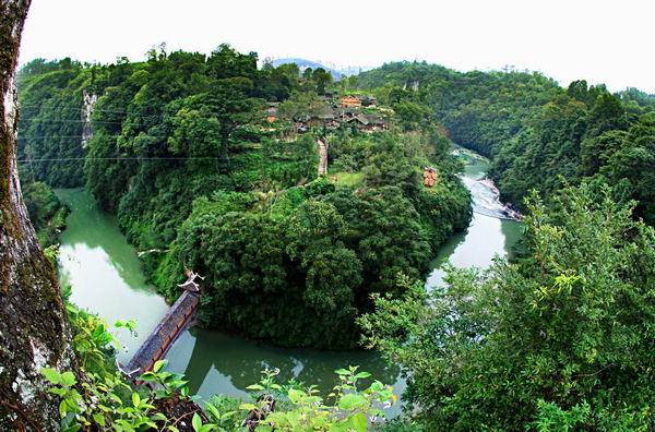 可以抽掉木板,斷掉追兵去路,具有戰(zhàn)略防御的功能,F(xiàn)在是苗族青年男女“趕邊邊場”(唱情歌、談戀愛)的地方。大家順著我手指的方向看,苗王河邊的山腰上的兩個天然的溶洞口象兩只大眼睛,還有長長的鼻子,這就是傳說中的“神象取水”了,F(xiàn)在我們到碼頭去坐游船,在苗王河泛舟,游覽苗王峽谷的山水風(fēng)光。